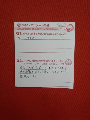 お車のご相談・ 査定だけでもOK! カンタン 入力 30秒 アップルがブランド買取始めました! お電話でも受付中! 受付時間10:00 ~ 19:00 0532-64-5911 お車のご相談・ 査定だけでもOK! カンタン 入力 30秒 アップルがブランド買取始めました! お電話でも受付中! 受付時間10:00 ~ 19:00 0532-64-5911 アップルがブランド買取始めました! お電話でも受付中! 受付時間10:00 ~ 19:00 0532-64-5911 店舗情報 在庫車 スタッフ紹介 ブログ お客様の声 キャンペーン 無料査定 click お客様の声 ご記入日: 2014/04/06 匿名様 ●愛車との思い出 インプレッサ●アップルに対する感想 店長さんが対応していただきましたが、買い取り金額の出るのも早く、満足のできる価格でした。 前へ 次へ お客様の声一覧を見る