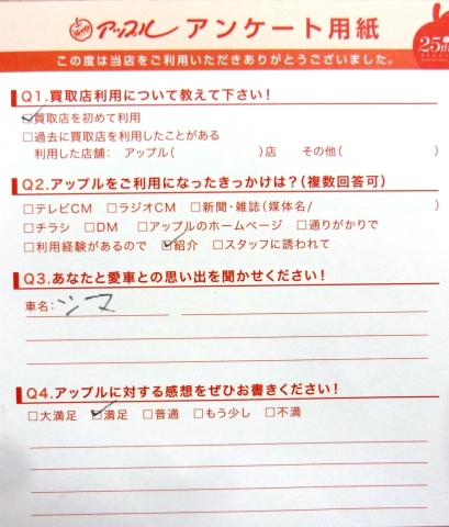 お車のご相談・ 査定だけでもOK! カンタン 入力 30秒 アップルがブランド買取始めました! お電話でも受付中! 受付時間10:00 ~ 19:00 0532-64-5911 お車のご相談・ 査定だけでもOK! カンタン 入力 30秒 アップルがブランド買取始めました! お電話でも受付中! 受付時間10:00 ~ 19:00 0532-64-5911 アップルがブランド買取始めました! お電話でも受付中! 受付時間10:00 ~ 19:00 0532-64-5911 店舗情報 在庫車 スタッフ紹介 ブログ お客様の声 キャンペーン 無料査定 click お客様の声 ご記入日: 2014/04/08 匿名様 車名 シーマ 前へ 次へ お客様の声一覧を見る