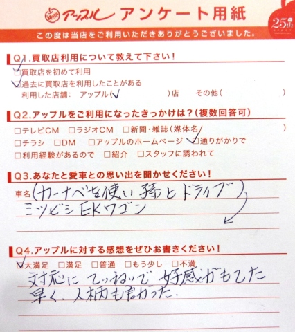 お車のご相談・ 査定だけでもOK! カンタン 入力 30秒 アップルがブランド買取始めました! お電話でも受付中! 受付時間10:00 ~ 19:00 0532-64-5911 お車のご相談・ 査定だけでもOK! カンタン 入力 30秒 アップルがブランド買取始めました! お電話でも受付中! 受付時間10:00 ~ 19:00 0532-64-5911 アップルがブランド買取始めました! お電話でも受付中! 受付時間10:00 ~ 19:00 0532-64-5911 店舗情報 在庫車 スタッフ紹介 ブログ お客様の声 キャンペーン 無料査定 click お客様の声 ご記入日: 2014/04/09 匿名様 ★愛車との思い出三菱 EKワゴンカーナビを使い孫とドライブ★アップルに対する感想対応に丁寧で好感が持てた早く、人柄もよかった。 前へ 次へ お客様の声一覧を見る
