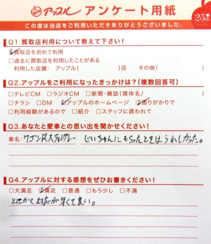 お車のご相談・ 査定だけでもOK! カンタン 入力 30秒 アップルがブランド買取始めました! お電話でも受付中! 受付時間10:00 ~ 19:00 0532-64-5911 お車のご相談・ 査定だけでもOK! カンタン 入力 30秒 アップルがブランド買取始めました! お電話でも受付中! 受付時間10:00 ~ 19:00 0532-64-5911 アップルがブランド買取始めました! お電話でも受付中! 受付時間10:00 ~ 19:00 0532-64-5911 店舗情報 在庫車 スタッフ紹介 ブログ お客様の声 キャンペーン 無料査定 click お客様の声 ご記入日: 2014/04/12 匿名様 ★愛車との思い出車名・ワゴンRスティングレーじいちゃんに貰った時はうれしかった。★アップルに対する感想とにかく対応が早くて良い。 前へ 次へ お客様の声一覧を見る
