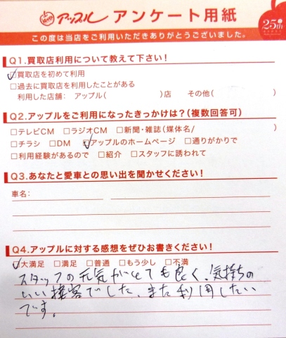 お車のご相談・ 査定だけでもOK! カンタン 入力 30秒 アップルがブランド買取始めました! お電話でも受付中! 受付時間10:00 ~ 19:00 0532-64-5911 お車のご相談・ 査定だけでもOK! カンタン 入力 30秒 アップルがブランド買取始めました! お電話でも受付中! 受付時間10:00 ~ 19:00 0532-64-5911 アップルがブランド買取始めました! お電話でも受付中! 受付時間10:00 ~ 19:00 0532-64-5911 店舗情報 在庫車 スタッフ紹介 ブログ お客様の声 キャンペーン 無料査定 click お客様の声 ご記入日: 2014/04/16 匿名様 ★愛車との思い出車名・★アップルに対する感想スタッフの元気がとても良く、気持ちの良い接客でした。また利用したいです。 前へ 次へ お客様の声一覧を見る