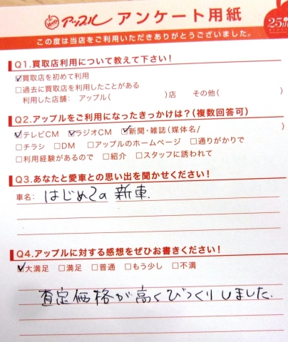 お車のご相談・ 査定だけでもOK! カンタン 入力 30秒 アップルがブランド買取始めました! お電話でも受付中! 受付時間10:00 ~ 19:00 0532-64-5911 お車のご相談・ 査定だけでもOK! カンタン 入力 30秒 アップルがブランド買取始めました! お電話でも受付中! 受付時間10:00 ~ 19:00 0532-64-5911 アップルがブランド買取始めました! お電話でも受付中! 受付時間10:00 ~ 19:00 0532-64-5911 店舗情報 在庫車 スタッフ紹介 ブログ お客様の声 キャンペーン 無料査定 click お客様の声 ご記入日: 2014/04/18 匿名様 ★愛車との思い出車名・はじめての新車★アップルに対する感想査定価格が高くびっくりしました。 前へ 次へ お客様の声一覧を見る
