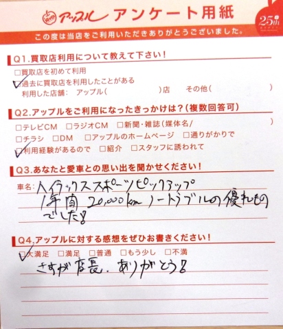 お車のご相談・ 査定だけでもOK! カンタン 入力 30秒 アップルがブランド買取始めました! お電話でも受付中! 受付時間10:00 ~ 19:00 0532-64-5911 お車のご相談・ 査定だけでもOK! カンタン 入力 30秒 アップルがブランド買取始めました! お電話でも受付中! 受付時間10:00 ~ 19:00 0532-64-5911 アップルがブランド買取始めました! お電話でも受付中! 受付時間10:00 ~ 19:00 0532-64-5911 店舗情報 在庫車 スタッフ紹介 ブログ お客様の声 キャンペーン 無料査定 click お客様の声 ご記入日: 2014/04/19 匿名様 ★愛車との思い出車名・ハイラックススポーツピックアップ1年間20000kmノートラブルの優れものでした!★アップルに対する感想さすが店長、ありがとう! 前へ 次へ お客様の声一覧を見る