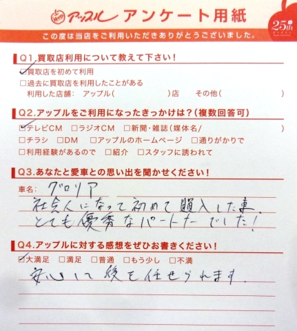 お車のご相談・ 査定だけでもOK! カンタン 入力 30秒 アップルがブランド買取始めました! お電話でも受付中! 受付時間10:00 ~ 19:00 0532-64-5911 お車のご相談・ 査定だけでもOK! カンタン 入力 30秒 アップルがブランド買取始めました! お電話でも受付中! 受付時間10:00 ~ 19:00 0532-64-5911 アップルがブランド買取始めました! お電話でも受付中! 受付時間10:00 ~ 19:00 0532-64-5911 店舗情報 在庫車 スタッフ紹介 ブログ お客様の声 キャンペーン 無料査定 click お客様の声 ご記入日: 2014/04/23 匿名様 ★愛車との思い出車名・グロリア社会人になって初めて購入した車とても優秀なパートナーでした!★アップルに対する感想安心して後を任せられます。 前へ 次へ お客様の声一覧を見る