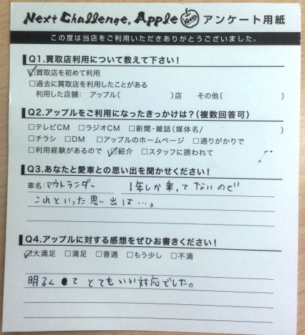 お車のご相談・ 査定だけでもOK! カンタン 入力 30秒 アップルがブランド買取始めました! お電話でも受付中! 受付時間10:00 ~ 19:00 0532-64-5911 お車のご相談・ 査定だけでもOK! カンタン 入力 30秒 アップルがブランド買取始めました! お電話でも受付中! 受付時間10:00 ~ 19:00 0532-64-5911 アップルがブランド買取始めました! お電話でも受付中! 受付時間10:00 ~ 19:00 0532-64-5911 店舗情報 在庫車 スタッフ紹介 ブログ お客様の声 キャンペーン 無料査定 click お客様の声 ご記入日: 2015/03/16 匿名様 車名 アウトランダー愛車との思い出1年しか乗っていないので、どれといった思い出は…。アップルに対する感想明るくてとても良い対応でした。 前へ 次へ お客様の声一覧を見る
