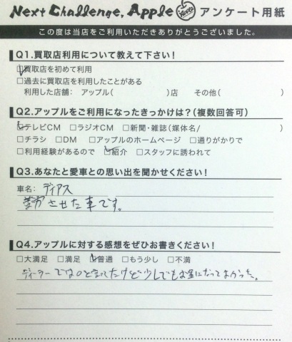 お車のご相談・ 査定だけでもOK! カンタン 入力 30秒 アップルがブランド買取始めました! お電話でも受付中! 受付時間10:00 ~ 19:00 0532-64-5911 お車のご相談・ 査定だけでもOK! カンタン 入力 30秒 アップルがブランド買取始めました! お電話でも受付中! 受付時間10:00 ~ 19:00 0532-64-5911 アップルがブランド買取始めました! お電話でも受付中! 受付時間10:00 ~ 19:00 0532-64-5911 店舗情報 在庫車 スタッフ紹介 ブログ お客様の声 キャンペーン 無料査定 click お客様の声 ご記入日: 2015/03/31 F様 車名 ディアスワゴン愛車との思い出苦労させた車です。アップルに対する感想ディーラーでは0と言ってたけど、少しでもお金になって良かった。 前へ 次へ お客様の声一覧を見る