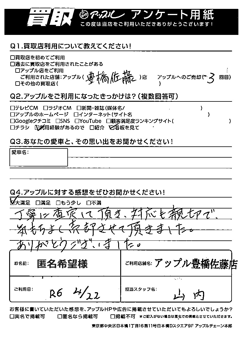 お車のご相談・ 査定だけでもOK! カンタン 入力 30秒 アップルがブランド買取始めました! お電話でも受付中! 受付時間10:00 ~ 19:00 0532-64-5911 お車のご相談・ 査定だけでもOK! カンタン 入力 30秒 アップルがブランド買取始めました! お電話でも受付中! 受付時間10:00 ~ 19:00 0532-64-5911 アップルがブランド買取始めました! お電話でも受付中! 受付時間10:00 ~ 19:00 0532-64-5911 店舗情報 在庫車 スタッフ紹介 ブログ お客様の声 キャンペーン 無料査定 click お客様の声 ご記入日: 2024/06/27 匿名希望様 ご利用日:R6年4月22日 担当:山内アップルに対する感想をぜひお聞かせください!丁寧に査定して頂き、対応も親切で気持ちよく売却させて頂きました。ありがとうございました。 前へ 次へ お客様の声一覧を見る