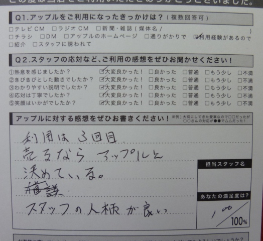 お車のご相談・ 査定だけでもOK! カンタン 入力 30秒 アップルがブランド買取始めました! お電話でも受付中! 受付時間10:00 ~ 19:00 0532-64-5911 お車のご相談・ 査定だけでもOK! カンタン 入力 30秒 アップルがブランド買取始めました! お電話でも受付中! 受付時間10:00 ~ 19:00 0532-64-5911 アップルがブランド買取始めました! お電話でも受付中! 受付時間10:00 ~ 19:00 0532-64-5911 店舗情報 在庫車 スタッフ紹介 ブログ お客様の声 キャンペーン 無料査定 click お客様の声 ご記入日: 2012/11/28 匿名様 アンケートのご記入まことにありがとうございます。お客様から寄せられたご意見ほど、私たちスタッフが奮い立つものはありません! 前へ 次へ お客様の声一覧を見る