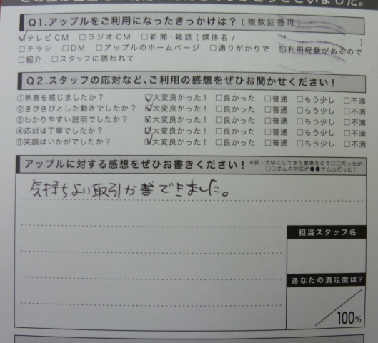 お車のご相談・ 査定だけでもOK! カンタン 入力 30秒 アップルがブランド買取始めました! お電話でも受付中! 受付時間10:00 ~ 19:00 0532-64-5911 お車のご相談・ 査定だけでもOK! カンタン 入力 30秒 アップルがブランド買取始めました! お電話でも受付中! 受付時間10:00 ~ 19:00 0532-64-5911 アップルがブランド買取始めました! お電話でも受付中! 受付時間10:00 ~ 19:00 0532-64-5911 店舗情報 在庫車 スタッフ紹介 ブログ お客様の声 キャンペーン 無料査定 click お客様の声 ご記入日: 2012/12/03 匿名様 アンケートの記入誠にありがとうございます。これからも、お客様目線で気持ちのいい、好感のもてる営業を目指します。 前へ 次へ お客様の声一覧を見る