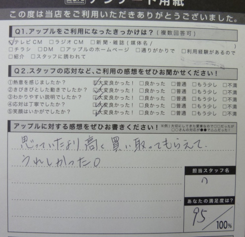お車のご相談・ 査定だけでもOK! カンタン 入力 30秒 アップルがブランド買取始めました! お電話でも受付中! 受付時間10:00 ~ 19:00 0532-64-5911 お車のご相談・ 査定だけでもOK! カンタン 入力 30秒 アップルがブランド買取始めました! お電話でも受付中! 受付時間10:00 ~ 19:00 0532-64-5911 アップルがブランド買取始めました! お電話でも受付中! 受付時間10:00 ~ 19:00 0532-64-5911 店舗情報 在庫車 スタッフ紹介 ブログ お客様の声 キャンペーン 無料査定 click お客様の声 ご記入日: 2012/12/05 匿名様 アンケートのご記入誠にありがとうございます。査定価格は常に頑張ってます!! 前へ 次へ お客様の声一覧を見る