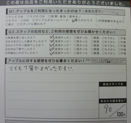 お車のご相談・ 査定だけでもOK! カンタン 入力 30秒 アップルがブランド買取始めました! お電話でも受付中! 受付時間10:00 ~ 19:00 0532-64-5911 お車のご相談・ 査定だけでもOK! カンタン 入力 30秒 アップルがブランド買取始めました! お電話でも受付中! 受付時間10:00 ~ 19:00 0532-64-5911 アップルがブランド買取始めました! お電話でも受付中! 受付時間10:00 ~ 19:00 0532-64-5911 店舗情報 在庫車 スタッフ紹介 ブログ お客様の声 キャンペーン 無料査定 click お客様の声 ご記入日: 2012/12/06 匿名様 アンケートのご記入誠にありがとうございます。 前へ 次へ お客様の声一覧を見る