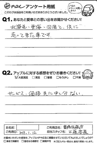 お車のご相談・ 査定だけでもOK! カンタン 入力 30秒 アップルがブランド買取始めました! お電話でも受付中! 受付時間10:00 ~ 19:00 0532-64-5911 お車のご相談・ 査定だけでもOK! カンタン 入力 30秒 アップルがブランド買取始めました! お電話でも受付中! 受付時間10:00 ~ 19:00 0532-64-5911 アップルがブランド買取始めました! お電話でも受付中! 受付時間10:00 ~ 19:00 0532-64-5911 店舗情報 在庫車 スタッフ紹介 ブログ お客様の声 キャンペーン 無料査定 click お客様の声 ご記入日: 2013/01/12 匿名希望様 【愛車との思い出】北海道、東海、四国と共に走って来た車です。【アップルに対する感想】サービス、価格共に申し分ない。 前へ 次へ お客様の声一覧を見る