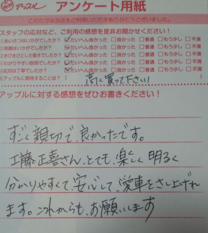 お車のご相談・ 査定だけでもOK! カンタン 入力 30秒 アップルがブランド買取始めました! お電話でも受付中! 受付時間10:00 ~ 19:00 0532-64-5911 お車のご相談・ 査定だけでもOK! カンタン 入力 30秒 アップルがブランド買取始めました! お電話でも受付中! 受付時間10:00 ~ 19:00 0532-64-5911 アップルがブランド買取始めました! お電話でも受付中! 受付時間10:00 ~ 19:00 0532-64-5911 店舗情報 在庫車 スタッフ紹介 ブログ お客様の声 キャンペーン 無料査定 click お客様の声 ご記入日: 2013/02/06 Y・A様 アンケートのご協力誠にありがとうございます。当店は、明るく・楽しく・元気よくをモット-に日々精進しております。3年後もアップルへのご来店お待ちしております。担当:工藤 前へ 次へ お客様の声一覧を見る