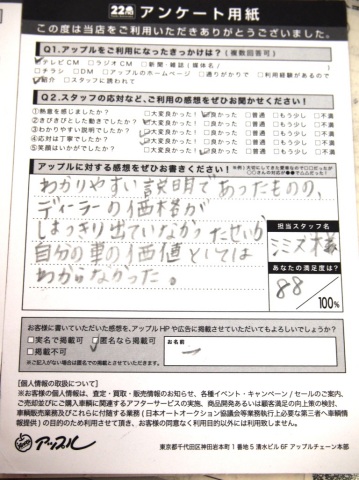 お車のご相談・ 査定だけでもOK! カンタン 入力 30秒 アップルがブランド買取始めました! お電話でも受付中! 受付時間10:00 ~ 19:00 0564-25-8118 お車のご相談・ 査定だけでもOK! カンタン 入力 30秒 アップルがブランド買取始めました! お電話でも受付中! 受付時間10:00 ~ 19:00 0564-25-8118 アップルがブランド買取始めました! お電話でも受付中! 受付時間10:00 ~ 19:00 0564-25-8118 店舗情報 在庫車 スタッフ紹介 ブログ お客様の声 キャンペーン お得 無料査定 click お客様の声 ご記入日: 2011/10/22 H.M様 わかりやすい説明であったものの、ディーラーの価格がはっきりでていなかったせいか自分の車の価値としてはわからなかった。 前へ 次へ お客様の声一覧を見る
