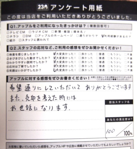 お車のご相談・ 査定だけでもOK! カンタン 入力 30秒 アップルがブランド買取始めました! お電話でも受付中! 受付時間10:00 ~ 19:00 0564-25-8118 お車のご相談・ 査定だけでもOK! カンタン 入力 30秒 アップルがブランド買取始めました! お電話でも受付中! 受付時間10:00 ~ 19:00 0564-25-8118 アップルがブランド買取始めました! お電話でも受付中! 受付時間10:00 ~ 19:00 0564-25-8118 店舗情報 在庫車 スタッフ紹介 ブログ お客様の声 キャンペーン お得 無料査定 click お客様の声 ご記入日: 2012/02/09 H.J様 希望通りにしていただいてありがとうございます。また売却を考えた時にはおせわになります。 前へ 次へ お客様の声一覧を見る