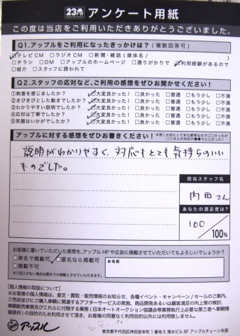 お車のご相談・ 査定だけでもOK! カンタン 入力 30秒 アップルがブランド買取始めました! お電話でも受付中! 受付時間10:00 ~ 19:00 0564-25-8118 お車のご相談・ 査定だけでもOK! カンタン 入力 30秒 アップルがブランド買取始めました! お電話でも受付中! 受付時間10:00 ~ 19:00 0564-25-8118 アップルがブランド買取始めました! お電話でも受付中! 受付時間10:00 ~ 19:00 0564-25-8118 店舗情報 在庫車 スタッフ紹介 ブログ お客様の声 キャンペーン お得 無料査定 click お客様の声 ご記入日: 2012/02/07 無記名様 説明がわかりやすく、対応もとても気持ちのいいものでした。 前へ 次へ お客様の声一覧を見る