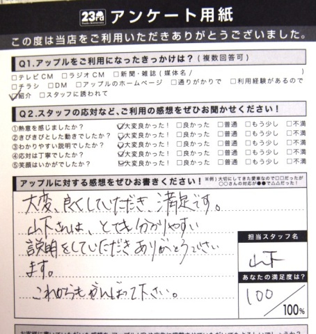 お車のご相談・ 査定だけでもOK! カンタン 入力 30秒 アップルがブランド買取始めました! お電話でも受付中! 受付時間10:00 ~ 19:00 0564-25-8118 お車のご相談・ 査定だけでもOK! カンタン 入力 30秒 アップルがブランド買取始めました! お電話でも受付中! 受付時間10:00 ~ 19:00 0564-25-8118 アップルがブランド買取始めました! お電話でも受付中! 受付時間10:00 ~ 19:00 0564-25-8118 店舗情報 在庫車 スタッフ紹介 ブログ お客様の声 キャンペーン お得 無料査定 click お客様の声 ご記入日: 2012/05/27 K.W様 大変、良くしていただき、満足です。山下さんは、とても分かりやすい説明をしていただきありがとうございます。これからもがんばって下さい。 前へ 次へ お客様の声一覧を見る