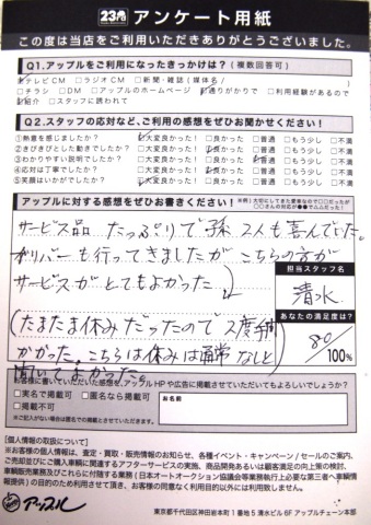 お車のご相談・ 査定だけでもOK! カンタン 入力 30秒 アップルがブランド買取始めました! お電話でも受付中! 受付時間10:00 ~ 19:00 0564-25-8118 お車のご相談・ 査定だけでもOK! カンタン 入力 30秒 アップルがブランド買取始めました! お電話でも受付中! 受付時間10:00 ~ 19:00 0564-25-8118 アップルがブランド買取始めました! お電話でも受付中! 受付時間10:00 ~ 19:00 0564-25-8118 店舗情報 在庫車 スタッフ紹介 ブログ お客様の声 キャンペーン お得 無料査定 click お客様の声 ご記入日: 2012/02/28 無記名様 サービス品たっぷりで孫2人も喜んでいた。ガリバーも行ってきましたがこちらの方がサービスがとてもよかった。(たまたま休みだったので2度手間かかった。こちらは休みは通常なしと聞いてよかった。) 前へ 次へ お客様の声一覧を見る