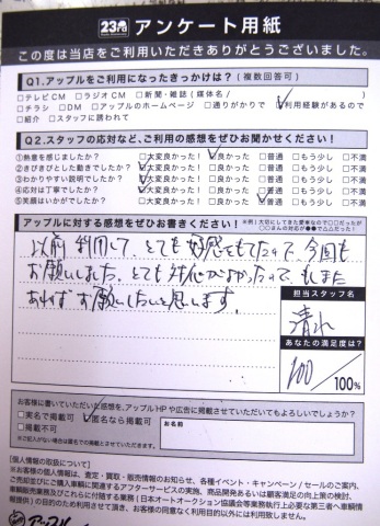 お車のご相談・ 査定だけでもOK! カンタン 入力 30秒 アップルがブランド買取始めました! お電話でも受付中! 受付時間10:00 ~ 19:00 0564-25-8118 お車のご相談・ 査定だけでもOK! カンタン 入力 30秒 アップルがブランド買取始めました! お電話でも受付中! 受付時間10:00 ~ 19:00 0564-25-8118 アップルがブランド買取始めました! お電話でも受付中! 受付時間10:00 ~ 19:00 0564-25-8118 店舗情報 在庫車 スタッフ紹介 ブログ お客様の声 キャンペーン お得 無料査定 click お客様の声 ご記入日: 2012/03/07 無記名様 以前りようして、とても好感をもてたので、今回もお願いしました。とても対応がよかったので、もしまたあればお願いしたいと思います。 前へ 次へ お客様の声一覧を見る