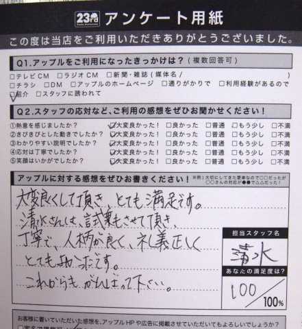 お車のご相談・ 査定だけでもOK! カンタン 入力 30秒 アップルがブランド買取始めました! お電話でも受付中! 受付時間10:00 ~ 19:00 0564-25-8118 お車のご相談・ 査定だけでもOK! カンタン 入力 30秒 アップルがブランド買取始めました! お電話でも受付中! 受付時間10:00 ~ 19:00 0564-25-8118 アップルがブランド買取始めました! お電話でも受付中! 受付時間10:00 ~ 19:00 0564-25-8118 店舗情報 在庫車 スタッフ紹介 ブログ お客様の声 キャンペーン お得 無料査定 click お客様の声 ご記入日: 2012/02/04 K.W様 大変良くして頂き、とても満足です。清水さんは試乗もさせて頂き、丁寧で、人柄良く、礼儀正しくとてもよかったです。これからもがんばって下さい。 前へ 次へ お客様の声一覧を見る