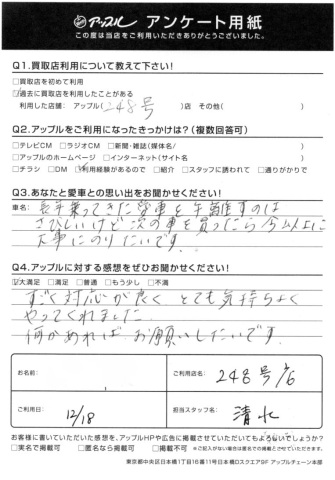お車のご相談・ 査定だけでもOK! カンタン 入力 30秒 アップルがブランド買取始めました! お電話でも受付中! 受付時間10:00 ~ 19:00 0564-25-8118 お車のご相談・ 査定だけでもOK! カンタン 入力 30秒 アップルがブランド買取始めました! お電話でも受付中! 受付時間10:00 ~ 19:00 0564-25-8118 アップルがブランド買取始めました! お電話でも受付中! 受付時間10:00 ~ 19:00 0564-25-8118 店舗情報 在庫車 スタッフ紹介 ブログ お客様の声 キャンペーン お得 無料査定 click お客様の声 ご記入日: 2017/12/18 岡崎市 U様 Q1.愛車との思い出をお聞かせください!長年乗ってきた愛車を手離すのはさびしいけど次の車を買ったら今以上に大事にのりたいです。Q2.アップルに対する感想をお聞かせください!すごく対応が良くとても気持ちよくやってくれました。何かあればお願いしたいです。担当スタッフ:清水 前へ 次へ お客様の声一覧を見る
