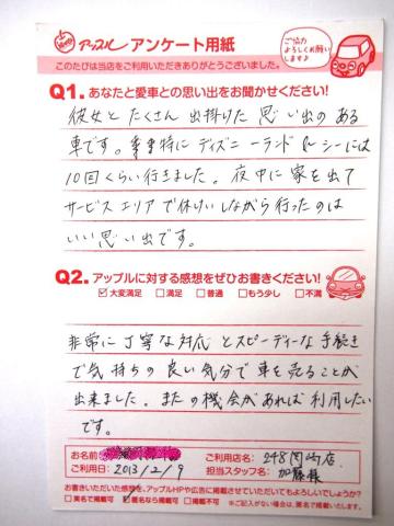 非常に丁寧な対応とスピーディーな手続きで気持ちの良い気分で車を売ることが出来ました。