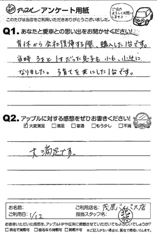 お車のご相談・ 査定だけでもOK! カンタン 入力 30秒 アップルがブランド買取始めました! お電話でも受付中! 受付時間【10:00-18:00 】 0120-24-9311 お車のご相談・ 査定だけでもOK! カンタン 入力 30秒 アップルがブランド買取始めました! お電話でも受付中! 受付時間【10:00-18:00 】 0120-24-9311 アップルがブランド買取始めました! お電話でも受付中! 受付時間【10:00-18:00 】 0120-24-9311 店舗情報 在庫車 スタッフ紹介 ブログ お客様の声 キャンペーン 無料査定 click お客様の声 ご記入日: 2013/01/12 匿名様 【愛車との思い出】育休から会社復帰する際、購入した1台です。当時3才と1才だった息子も小6、小4になりました。子育てを共にした1台です。【アップルへの感想】大満足です。 前へ 次へ お客様の声一覧を見る