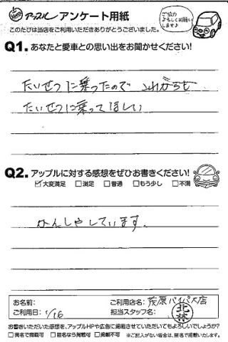 お車のご相談・ 査定だけでもOK! カンタン 入力 30秒 アップルがブランド買取始めました! お電話でも受付中! 受付時間【10:00-18:00 】 0120-24-9311 お車のご相談・ 査定だけでもOK! カンタン 入力 30秒 アップルがブランド買取始めました! お電話でも受付中! 受付時間【10:00-18:00 】 0120-24-9311 アップルがブランド買取始めました! お電話でも受付中! 受付時間【10:00-18:00 】 0120-24-9311 店舗情報 在庫車 スタッフ紹介 ブログ お客様の声 キャンペーン 無料査定 click お客様の声 ご記入日: 2013/01/16 匿名様 【愛車との思い出】たいせつに乗ったので、これからもたいせつに乗ってほしい。【アップルへの感想】かんしゃしています。 前へ 次へ お客様の声一覧を見る