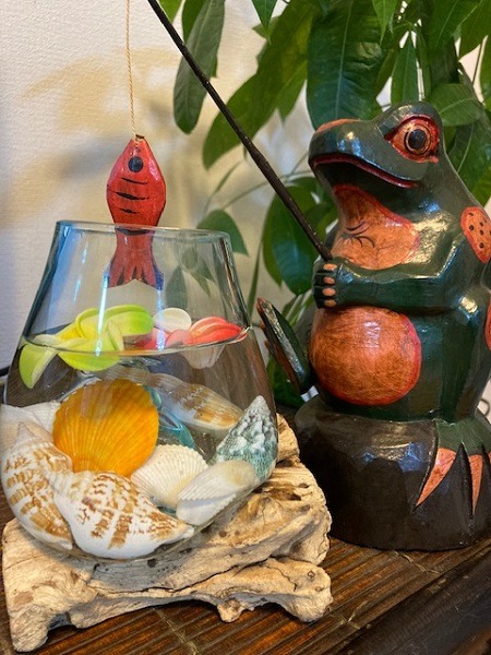 我が家のカエルさんが釣りをしている様に飾ってみました~~