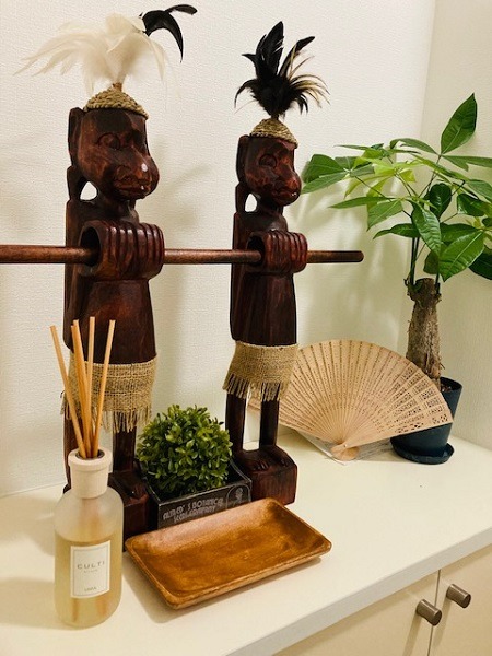 リビングにはトカゲさんや戦士?のような置物やバンブー素材の家具等あります(笑)