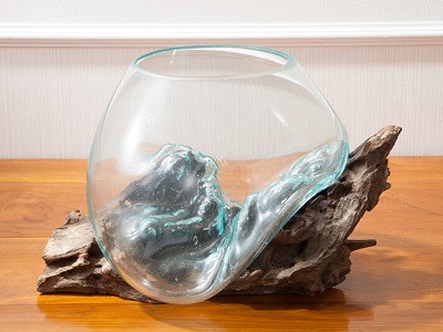 流木に熱したガラスを直接吹き付けて創られており