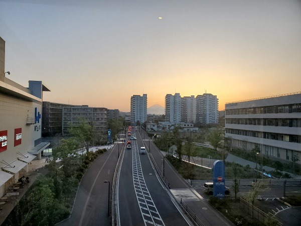 夕方の街並みのマンションの間から見える綺麗な富士山…。