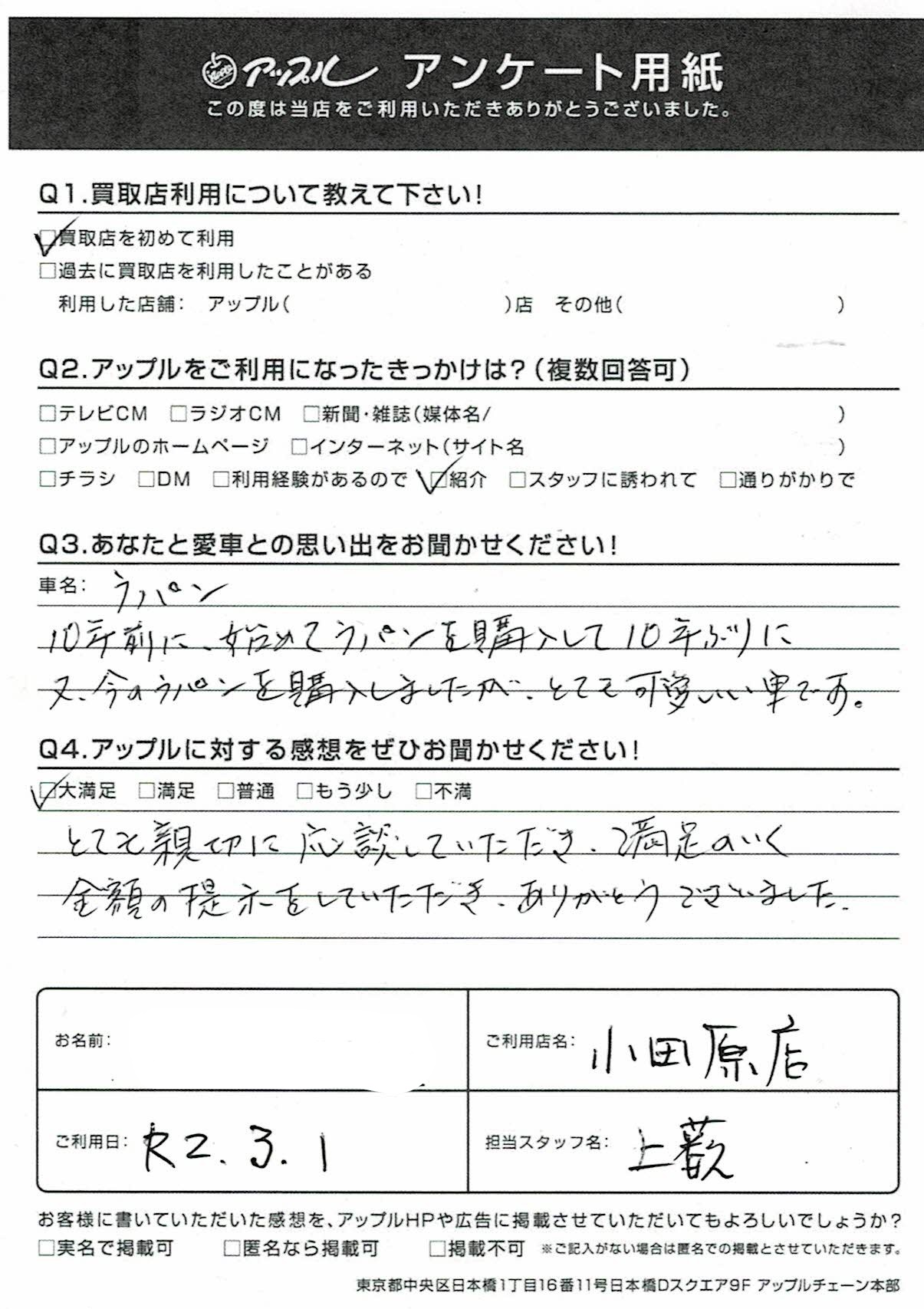 お車のご相談・ 査定だけでもOK! カンタン 入力 30秒 アップルがブランド買取始めました! お電話でも受付中! 受付時間10:00 ~ 19:00 0465-49-5503 お車のご相談・ 査定だけでもOK! カンタン 入力 30秒 アップルがブランド買取始めました! お電話でも受付中! 受付時間10:00 ~ 19:00 0465-49-5503 アップルがブランド買取始めました! お電話でも受付中! 受付時間10:00 ~ 19:00 0465-49-5503 店舗情報 在庫車 スタッフ紹介 ブログ お客様の声 キャンペーン 無料査定 click お客様の声 ご記入日: 2020/03/01 T様 車名:スズキ アルトラパン ラパン(アルト) とても親切に応談して頂き満足のいく金額提示をして頂きありがとうございました。 前へ 次へ お客様の声一覧を見る