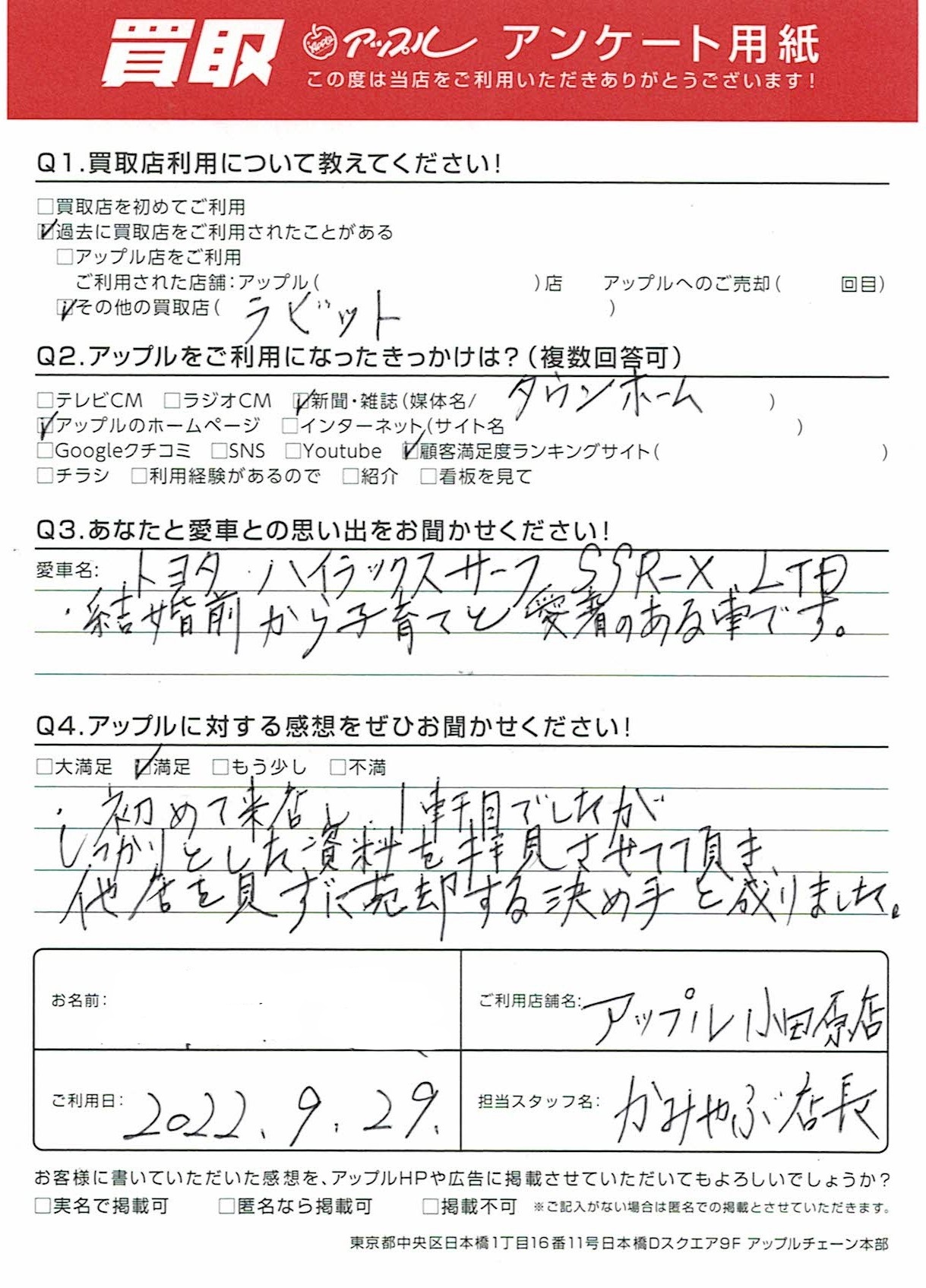 お車のご相談・ 査定だけでもOK! カンタン 入力 30秒 アップルがブランド買取始めました! お電話でも受付中! 受付時間10:00 ~ 19:00 0465-49-5503 お車のご相談・ 査定だけでもOK! カンタン 入力 30秒 アップルがブランド買取始めました! お電話でも受付中! 受付時間10:00 ~ 19:00 0465-49-5503 アップルがブランド買取始めました! お電話でも受付中! 受付時間10:00 ~ 19:00 0465-49-5503 店舗情報 在庫車 スタッフ紹介 ブログ お客様の声 キャンペーン 無料査定 click お客様の声 ご記入日: 2022/09/29 K様 車名:トヨタ ハイラックスサーフ 初めて来店し1軒目でしたがしっかりとした資料を拝見させて頂き他社を見ずに売却する決め手となりました。 前へ 次へ お客様の声一覧を見る