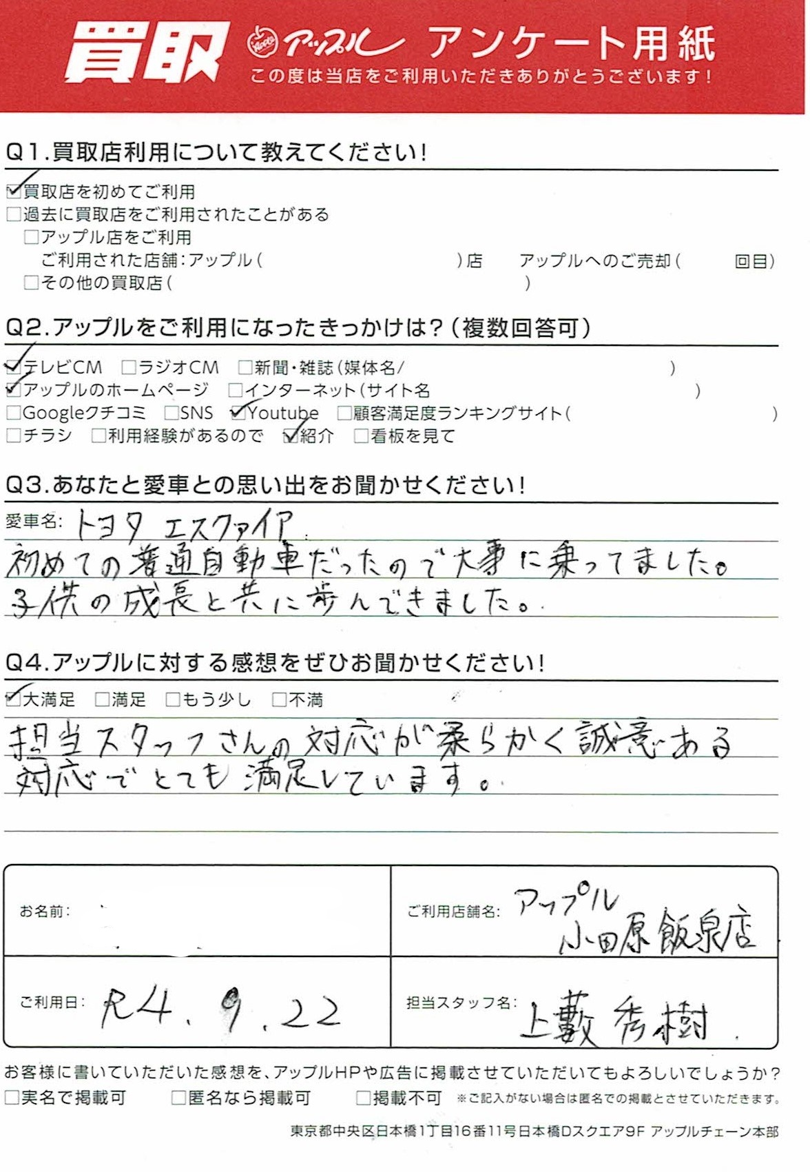 お車のご相談・ 査定だけでもOK! カンタン 入力 30秒 アップルがブランド買取始めました! お電話でも受付中! 受付時間10:00 ~ 19:00 0465-49-5503 お車のご相談・ 査定だけでもOK! カンタン 入力 30秒 アップルがブランド買取始めました! お電話でも受付中! 受付時間10:00 ~ 19:00 0465-49-5503 アップルがブランド買取始めました! お電話でも受付中! 受付時間10:00 ~ 19:00 0465-49-5503 店舗情報 在庫車 スタッフ紹介 ブログ お客様の声 キャンペーン 無料査定 click お客様の声 ご記入日: 2022/09/22 K様 車名:トヨタ エスクァイア 担当スタッフさんの対応が柔らかく誠意ある対応でとても満足しています。 前へ 次へ お客様の声一覧を見る