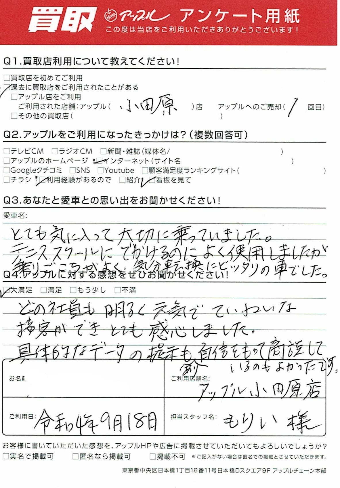 お車のご相談・ 査定だけでもOK! カンタン 入力 30秒 アップルがブランド買取始めました! お電話でも受付中! 受付時間10:00 ~ 19:00 0465-49-5503 お車のご相談・ 査定だけでもOK! カンタン 入力 30秒 アップルがブランド買取始めました! お電話でも受付中! 受付時間10:00 ~ 19:00 0465-49-5503 アップルがブランド買取始めました! お電話でも受付中! 受付時間10:00 ~ 19:00 0465-49-5503 店舗情報 在庫車 スタッフ紹介 ブログ お客様の声 キャンペーン 無料査定 click お客様の声 ご記入日: 2022/09/18 I様 車名:フォルクスワーゲン T-Roc どの社員も明るく元気で丁寧な接客ができとても感心しました。具体的なデータの提示もあり自信を持って商談しているのも良かったです。 前へ 次へ お客様の声一覧を見る