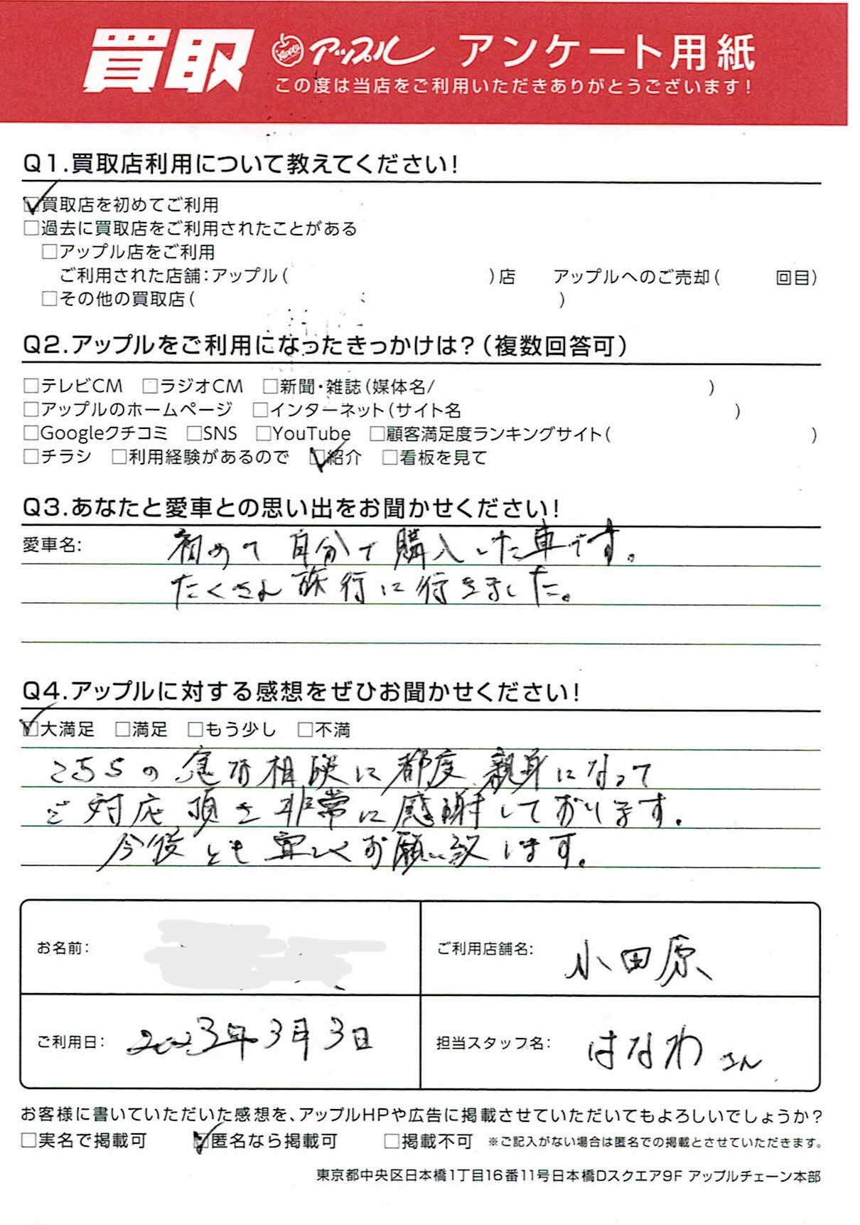 お車のご相談・ 査定だけでもOK! カンタン 入力 30秒 アップルがブランド買取始めました! お電話でも受付中! 受付時間10:00 ~ 19:00 0465-49-5503 お車のご相談・ 査定だけでもOK! カンタン 入力 30秒 アップルがブランド買取始めました! お電話でも受付中! 受付時間10:00 ~ 19:00 0465-49-5503 アップルがブランド買取始めました! お電話でも受付中! 受付時間10:00 ~ 19:00 0465-49-5503 店舗情報 在庫車 スタッフ紹介 ブログ お客様の声 キャンペーン 無料査定 click お客様の声 ご記入日: 2023/03/03 N様 車名:アウディ A3 こちらの急な相談に都度親身になってご対応頂き非常に感謝しております。今後とも宜しくお願い致します。 前へ 次へ お客様の声一覧を見る