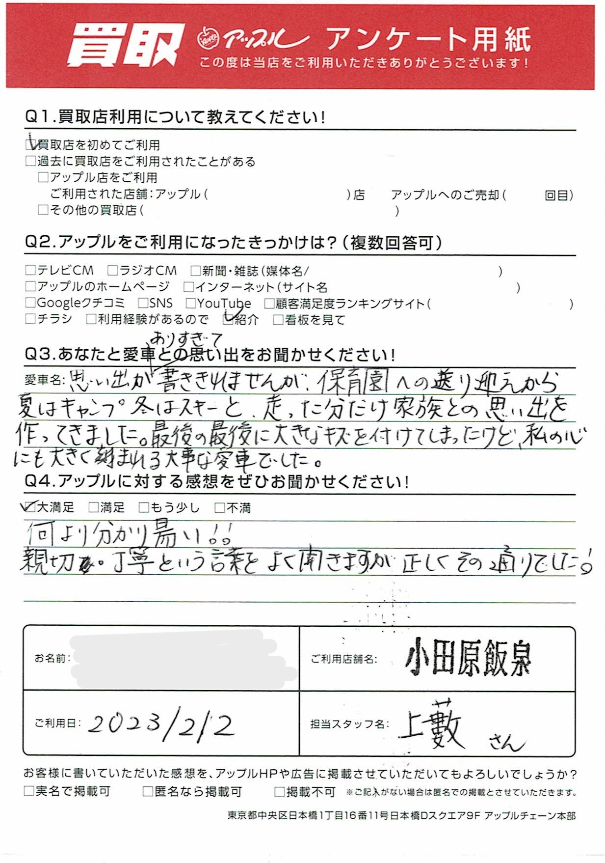 お車のご相談・ 査定だけでもOK! カンタン 入力 30秒 アップルがブランド買取始めました! お電話でも受付中! 受付時間10:00 ~ 19:00 0465-49-5503 お車のご相談・ 査定だけでもOK! カンタン 入力 30秒 アップルがブランド買取始めました! お電話でも受付中! 受付時間10:00 ~ 19:00 0465-49-5503 アップルがブランド買取始めました! お電話でも受付中! 受付時間10:00 ~ 19:00 0465-49-5503 店舗情報 在庫車 スタッフ紹介 ブログ お客様の声 キャンペーン 無料査定 click お客様の声 ご記入日: 2023/02/02 Y様 車名:日産 エクストレイル 何より分かり易い!!親切・丁寧という言葉をよく聞きますが、正しくその通りでした。 前へ 次へ お客様の声一覧を見る