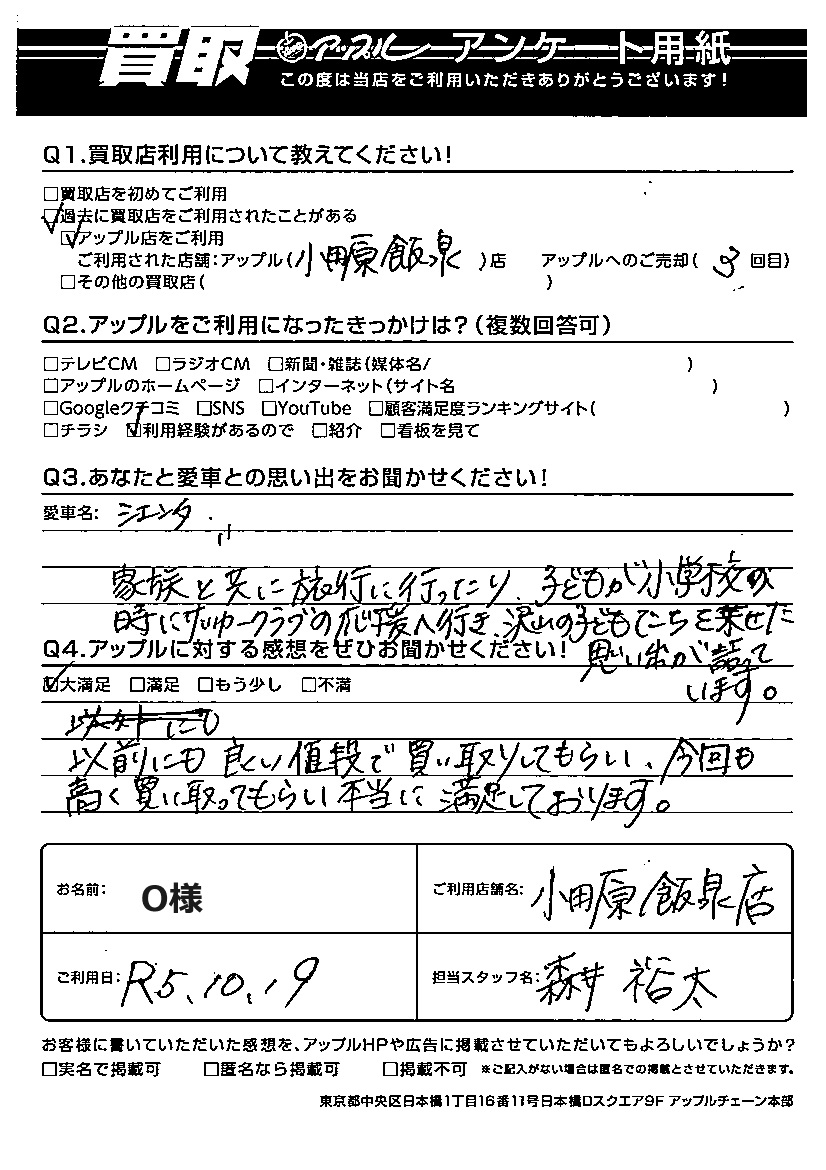 O様 車名:トヨタ シエンタ