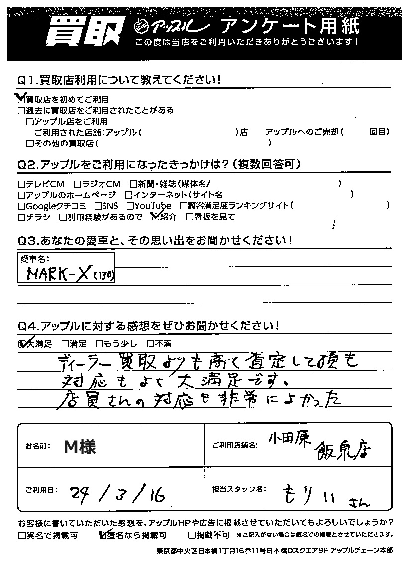 お車のご相談・ 査定だけでもOK! カンタン 入力 30秒 アップルがブランド買取始めました! お電話でも受付中! 受付時間10:00 ~ 19:00 0465-49-5503 お車のご相談・ 査定だけでもOK! カンタン 入力 30秒 アップルがブランド買取始めました! お電話でも受付中! 受付時間10:00 ~ 19:00 0465-49-5503 アップルがブランド買取始めました! お電話でも受付中! 受付時間10:00 ~ 19:00 0465-49-5503 店舗情報 在庫車 スタッフ紹介 ブログ お客様の声 キャンペーン 無料査定 click お客様の声 ご記入日: 2024/05/30 M様 車名:トヨタ マークX ご利用日:2024年3月16日 担当:森井アップルに対する感想をぜひお聞かせください!ディーラー買取よりも高く査定して頂き対応もよく大満足です。店員さんの対応も非常によかった。 前へ 次へ お客様の声一覧を見る