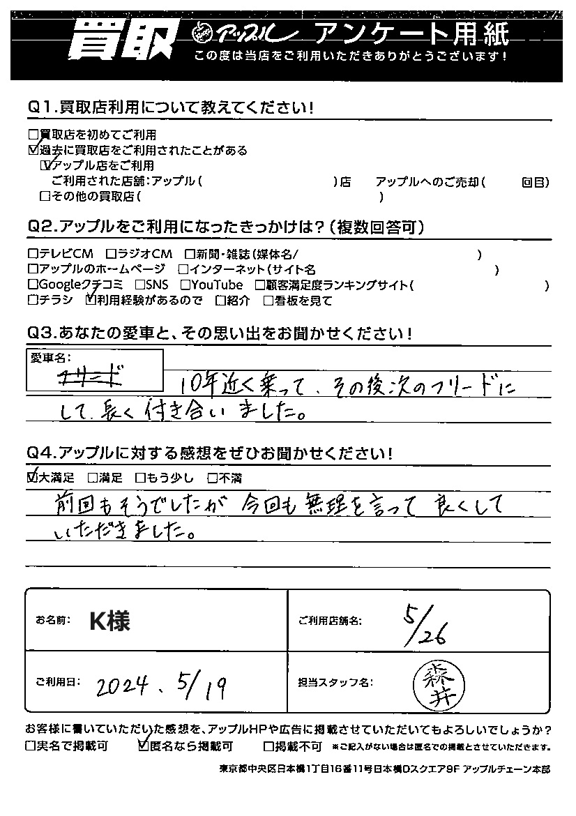 お車のご相談・ 査定だけでもOK! カンタン 入力 30秒 アップルがブランド買取始めました! お電話でも受付中! 受付時間10:00 ~ 19:00 0465-49-5503 お車のご相談・ 査定だけでもOK! カンタン 入力 30秒 アップルがブランド買取始めました! お電話でも受付中! 受付時間10:00 ~ 19:00 0465-49-5503 アップルがブランド買取始めました! お電話でも受付中! 受付時間10:00 ~ 19:00 0465-49-5503 店舗情報 在庫車 スタッフ紹介 ブログ お客様の声 キャンペーン 無料査定 click お客様の声 ご記入日: 2024/07/11 K様 車名:ホンダ フリード(H28年9月以降のハイブリッド含む) ご利用日:2024年5月19日 担当:森井アップルに対する感想をぜひお聞かせください!前回もそうでしたが、今回も無理を言って 良くしていただきました。 前へ 次へ お客様の声一覧を見る