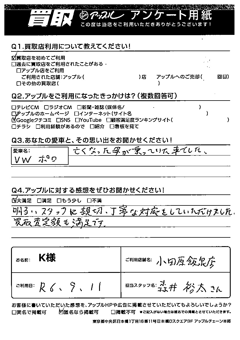 明るいスタッフに親切・丁寧な対応をしていただけました。買取査定額も満足です。