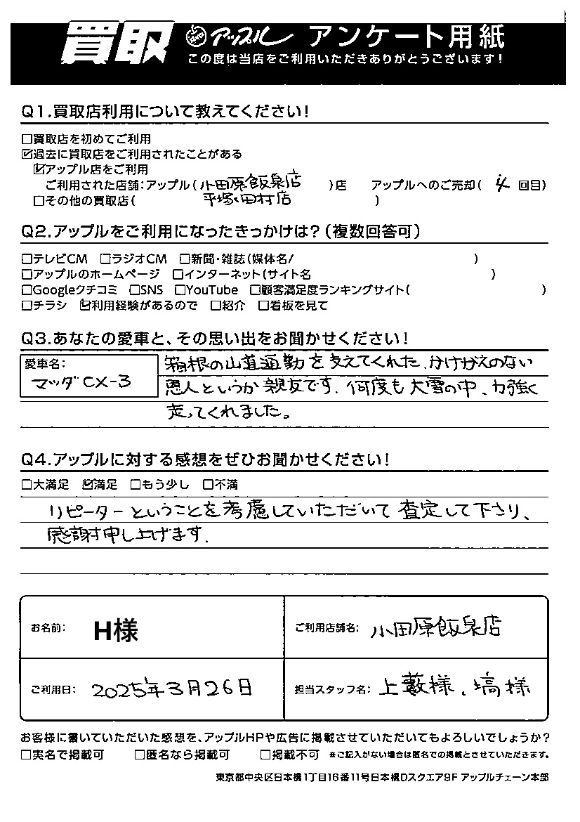リピーターということを考慮していただいて査定して下さり、感謝申し上げます。