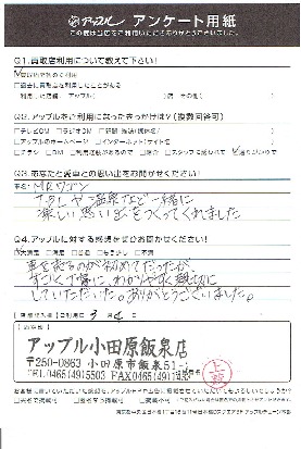 お車のご相談・ 査定だけでもOK! カンタン 入力 30秒 アップルがブランド買取始めました! お電話でも受付中! 受付時間10:00 ~ 19:00 0465-49-5503 お車のご相談・ 査定だけでもOK! カンタン 入力 30秒 アップルがブランド買取始めました! お電話でも受付中! 受付時間10:00 ~ 19:00 0465-49-5503 アップルがブランド買取始めました! お電話でも受付中! 受付時間10:00 ~ 19:00 0465-49-5503 店舗情報 在庫車 スタッフ紹介 ブログ お客様の声 キャンペーン 無料査定 click お客様の声 ご記入日: 2017/03/04 T様 車を売るのが初めてだったが、すごく丁寧に、わかりやすく親切にして頂いた。ありがとうございました。☆T様、この度はご売却ありがとうございました!ご満足してご売却頂き、こちらこそ感謝致します! 前へ 次へ お客様の声一覧を見る