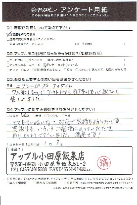 お車のご相談・ 査定だけでもOK! カンタン 入力 30秒 アップルがブランド買取始めました! お電話でも受付中! 受付時間10:00 ~ 19:00 0465-49-5503 お車のご相談・ 査定だけでもOK! カンタン 入力 30秒 アップルがブランド買取始めました! お電話でも受付中! 受付時間10:00 ~ 19:00 0465-49-5503 アップルがブランド買取始めました! お電話でも受付中! 受付時間10:00 ~ 19:00 0465-49-5503 店舗情報 在庫車 スタッフ紹介 ブログ お客様の声 キャンペーン 無料査定 click お客様の声 ご記入日: 2017/01/07 S様 とても丁寧な対応で気持ち良かったです。買取もいろいろご相談に乗って頂きありがとうございました。満足です!☆S様にご満足頂けて良かったです!ご売却誠にありがとうございました! 前へ 次へ お客様の声一覧を見る