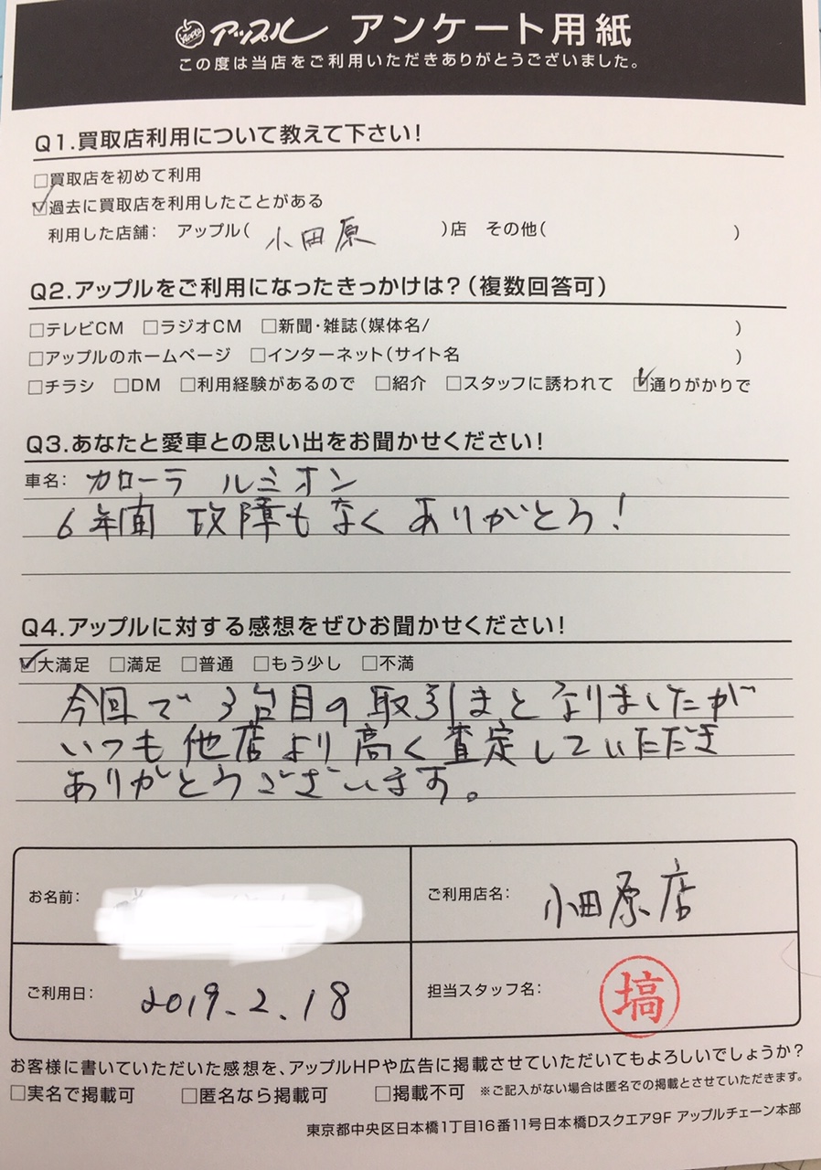 今回で3台目の取引となりましたが、いつも他店より高く査定して頂きありがとうございます。