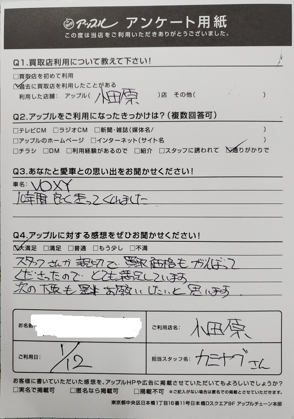 お車のご相談・ 査定だけでもOK! カンタン 入力 30秒 アップルがブランド買取始めました! お電話でも受付中! 受付時間10:00 ~ 19:00 0465-49-5503 お車のご相談・ 査定だけでもOK! カンタン 入力 30秒 アップルがブランド買取始めました! お電話でも受付中! 受付時間10:00 ~ 19:00 0465-49-5503 アップルがブランド買取始めました! お電話でも受付中! 受付時間10:00 ~ 19:00 0465-49-5503 店舗情報 在庫車 スタッフ紹介 ブログ お客様の声 キャンペーン 無料査定 click お客様の声 ご記入日: 2020/01/12 小田原市 S様 車名:トヨタ ヴォクシー スタッフさんが親切で買取価格もがんばってくださったのでとても満足しています。次の下取りも是非お願いしたい思います。 前へ 次へ お客様の声一覧を見る