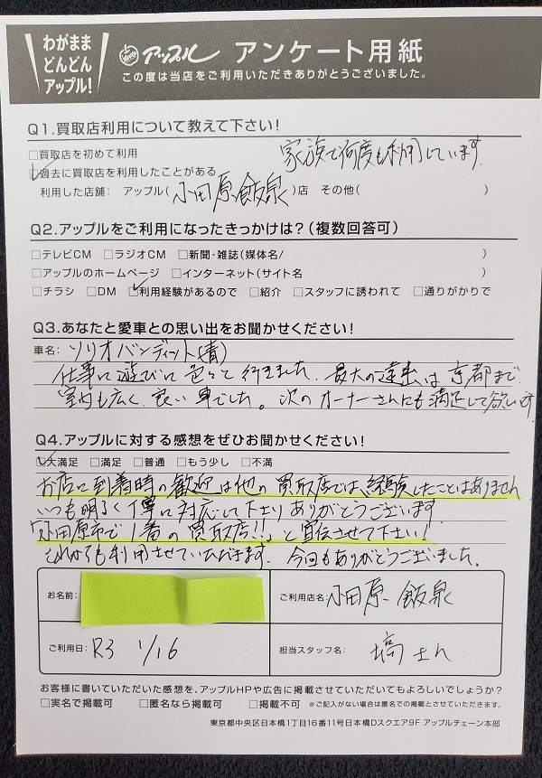 小田原市 H様 車名:スズキ ソリオ