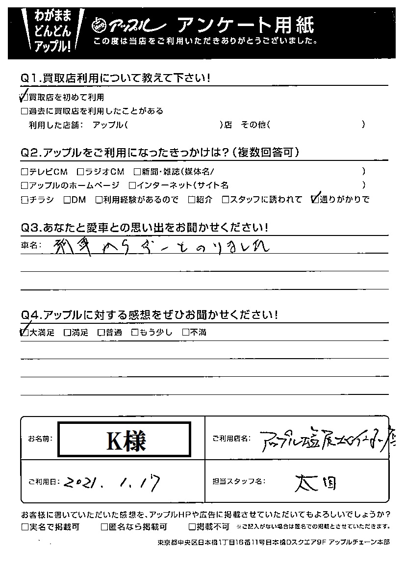 お車のご相談・ 査定だけでもOK! カンタン 入力 30秒 アップルがブランド買取始めました! お電話でも受付中! 受付時間10:00 ~ 19:00 0263-57-8288 お車のご相談・ 査定だけでもOK! カンタン 入力 30秒 アップルがブランド買取始めました! お電話でも受付中! 受付時間10:00 ~ 19:00 0263-57-8288 アップルがブランド買取始めました! お電話でも受付中! 受付時間10:00 ~ 19:00 0263-57-8288 店舗情報 在庫車 スタッフ紹介 ブログ お客様の声 キャンペーン 無料査定 click お客様の声 ご記入日: 2021/01/17 K様 Q あなたと愛車との思い出をお聞かせください!新車からずーとのりました。Q アップルに対する感想をぜひお聞かせください!感想:大満足 前へ 次へ お客様の声一覧を見る