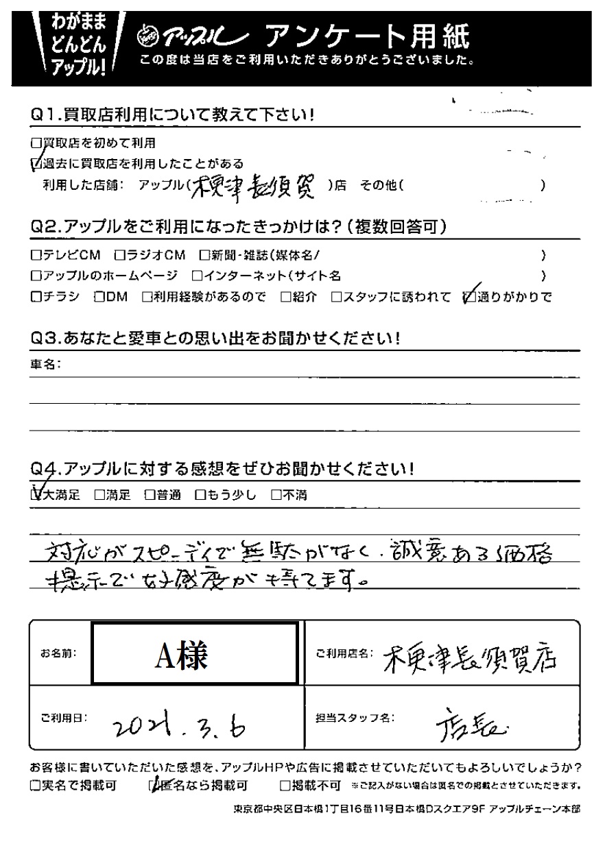 お車のご相談・ 査定だけでもOK! カンタン 入力 30秒 アップルがブランド買取始めました! お電話でも受付中! 受付時間10:00 ~ 18:00最終受付 0438-23-1231 お車のご相談・ 査定だけでもOK! カンタン 入力 30秒 アップルがブランド買取始めました! お電話でも受付中! 受付時間10:00 ~ 18:00最終受付 0438-23-1231 アップルがブランド買取始めました! お電話でも受付中! 受付時間10:00 ~ 18:00最終受付 0438-23-1231 店舗情報 在庫車 スタッフ紹介 ブログ お客様の声 キャンペーン お得 無料査定 click お客様の声 ご記入日: 2021/03/06 A様 Q アップルに対する感想をぜひお聞かせください!感想:大満足対応がスピーディーで無駄がなく、誠意ある価格提示で好感度が持てます。 前へ 次へ お客様の声一覧を見る